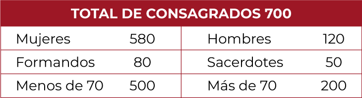 Pertenecen a la vida consagrada los institutos religiosos, los institutos seculares, las sociedades de vida apostólica, los ermitaños y las nuevas formas de consagración. En nuestra Arquidiócesis de San Luis Potosı́ tenemos un número aproximado de 700 consagrados. De ellos, con ellos y para ellos es Salud y Comunión, A.C.